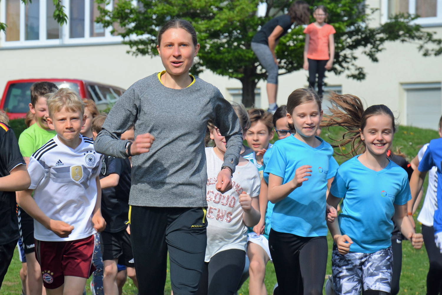 Pliezhäuser Schulkinder absolvierten mit Elena Burkard, einer der besten Hindernisläuferinnen Europas, eine Laufeinheit und bereiten sich auf einen Laufwettbewerb am 11. Mai vor.