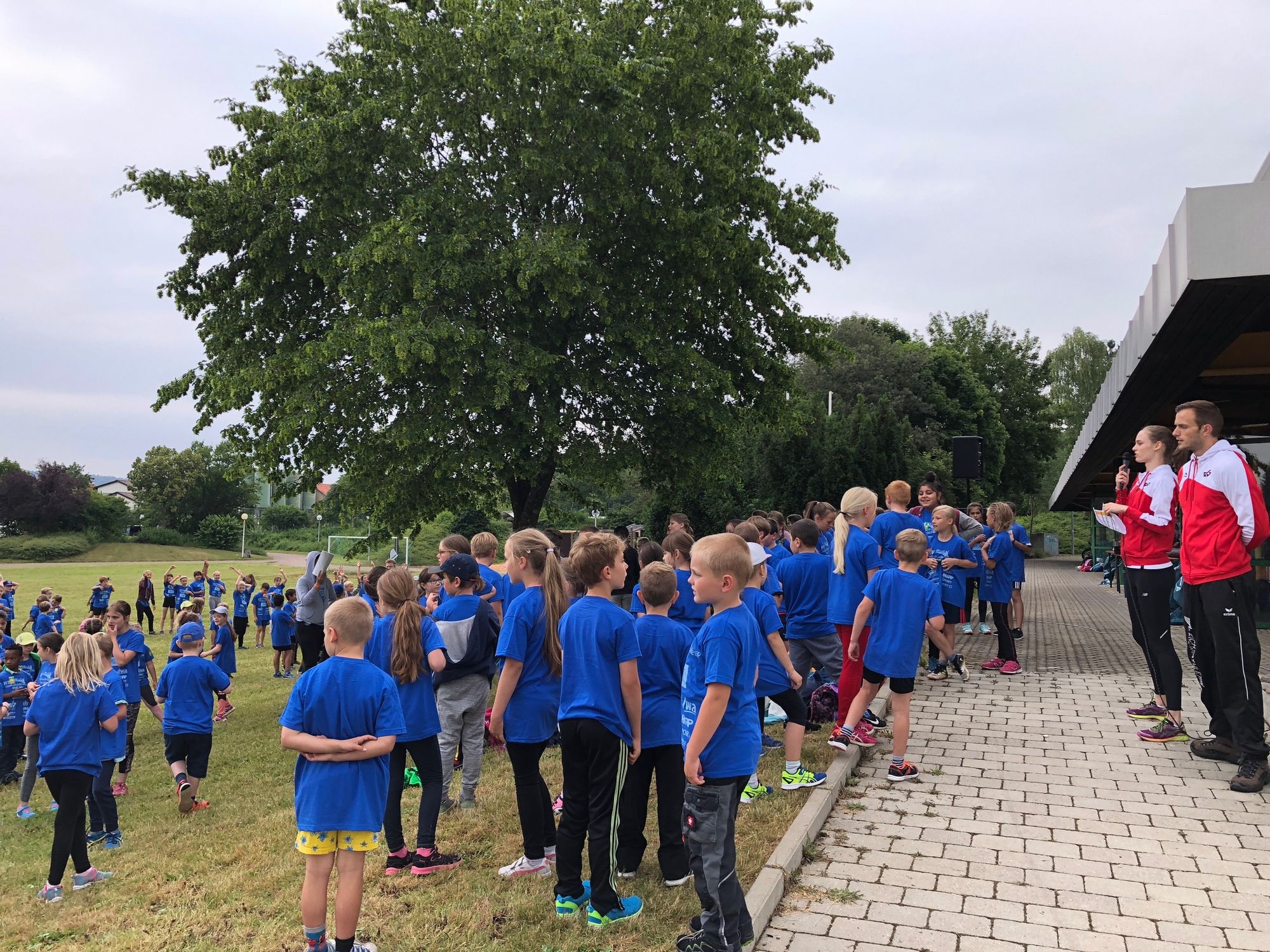 Nachdem alle Helfer und die rund 330 Kinder von der Grundschule Zang, Seebergschule Söhnstetten und Hillerschule mit blauen T-Shirts von der AOK und weiteren Projektsponsoren ausgestattet waren, begrüßte sie Herr Rieberger in seiner Funktion als stellvertretender Bürgermeister. "Heute geht es für euch vor Allem darum, Spaß zu haben!", betonte er. Damit hat er ein Ziel von WLV Kinderleicht-Athletik VOR ORT genau richtig erfasst. Projektleiter und Bildungsreferent des Württembergischen Leichtathletik-Verbandes Rene Stauß erklärt: "Heute wird nichts gestoppt, gemessen oder aufgeschrieben. Die Kinder sollen Spaß an der Leichtathletik finden und neue Bewegungserfahrung sammeln."