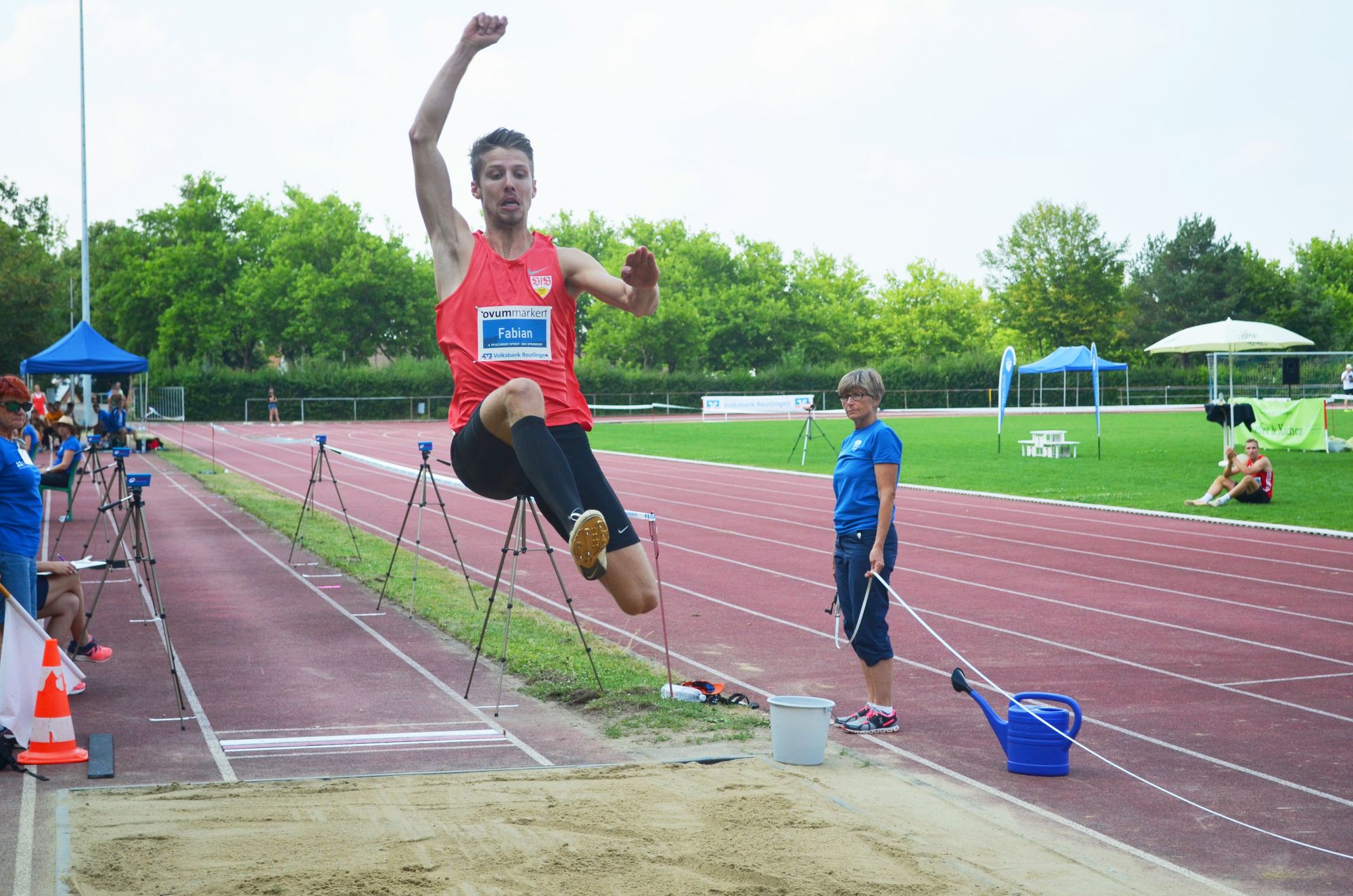 Im Weitsprung der Herren ließ Olympiateilnehmer Fabian Heinle (VfB Stuttgart) nichts anbrennen und sicherte sich mit 7,68m den Sieg vor Max Kottmann (VfB Stuttgart) mit 7,43m. Damit überbot der 24-jährige Heinle den Stadionrekord, den bis dato der zweitplatzierte Kottmann innehatte und wurde als erster Weitspringer mit dem Sprint- und Sprungcup, der traditionell für die beste Tagesleistung verliehen wird, ausgezeichnet. Die Pfullinger Starter Simon Tuttaß und Maximilian Baisch belegten die Plätze 5 und 7 mit 6,72m bzw. 6,02m. Im Weitsprung der Frauen siegte Maria Herbinger (SSV Ulm) mit 5,77m und konnte sich damit im letzten Versuch knapp vor Lena Stäbler (LG Filder) mit 5,75m und der Lokalmatadorin vom VfL Pfullingen Katharina Dobler mit 5,58m platzieren.